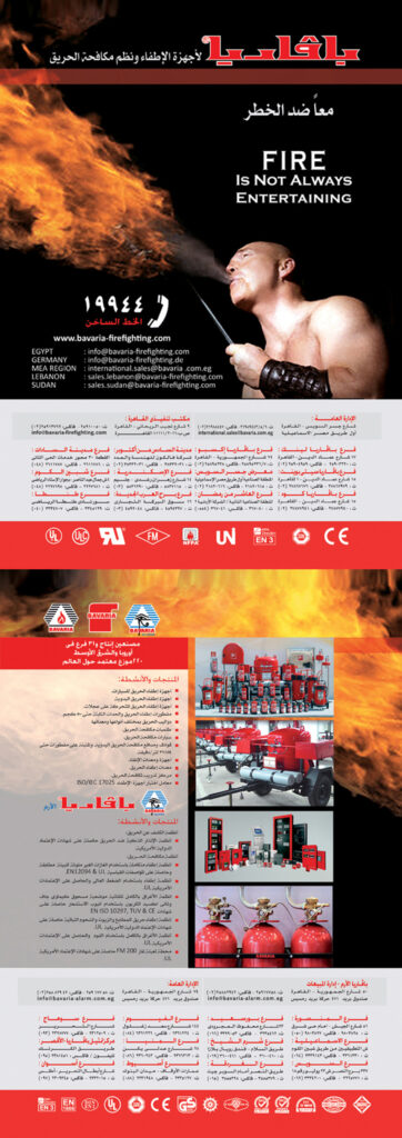 أجهزة إطفاء ونظم مكافحة الحريق ( أجهزة إطفاء السيارات – أجهزة إطفاء الحريق اليدوية – أجهزة إطفاء متحركة على عجلات – مقطورات إطفاء ثابتة – طلمبات مكافحة الحريق – سيارات مكافحة الحريق – قواذف ومدافع مكافحة الحريق اليدوية والمثبتة على مقطورات – أجهزة ومعدات الإنقاذ – معدات إطفاء الحريق – مركز تدريب لمكافحة الحريق – معامل إختبار أجهزة الإطفاء