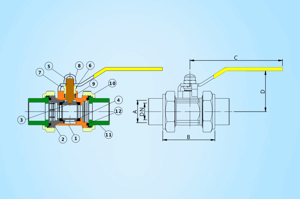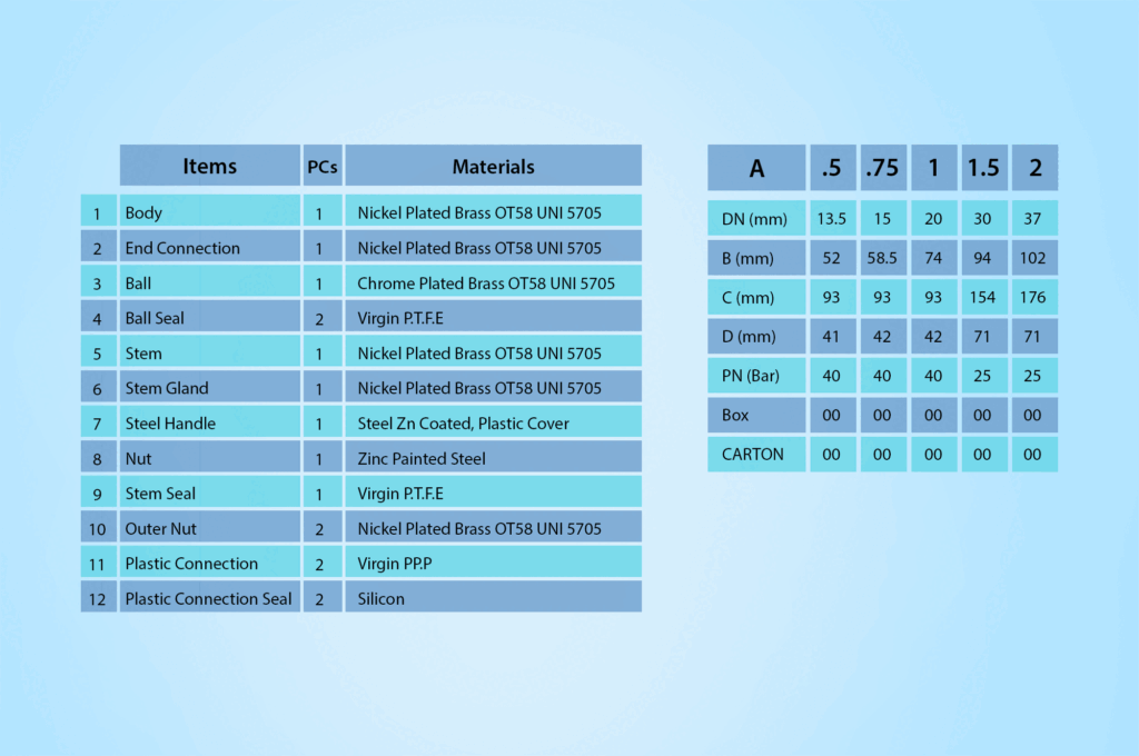صمام PPR - EWB مصنوع من النحاس عالي الجودة بتقنية التشكيل الحراري الحديثة. بدلاً من المطاط، يُستخدم التفلون كحلقة داعمة للكرة لحمايتها من التسرب، مما يضمن فتحًا وإغلاقًا سلسين ويطيل عمرها الافتراضي. الكرة التي تتحكم بتدفق الماء مصنوعة من النحاس المقاوم للصدأ طوال عمر المنتج. المقبض مصنوع من الألومنيوم المصبوب ومطلي بالإيبوكسي المقاوم للصدأ أيضًا. يتم اختبار كل صمام كروي للتأكد من عدم وجود تسريب قبل البيع. يتوفر جسم الصمام بطلاء كروم.