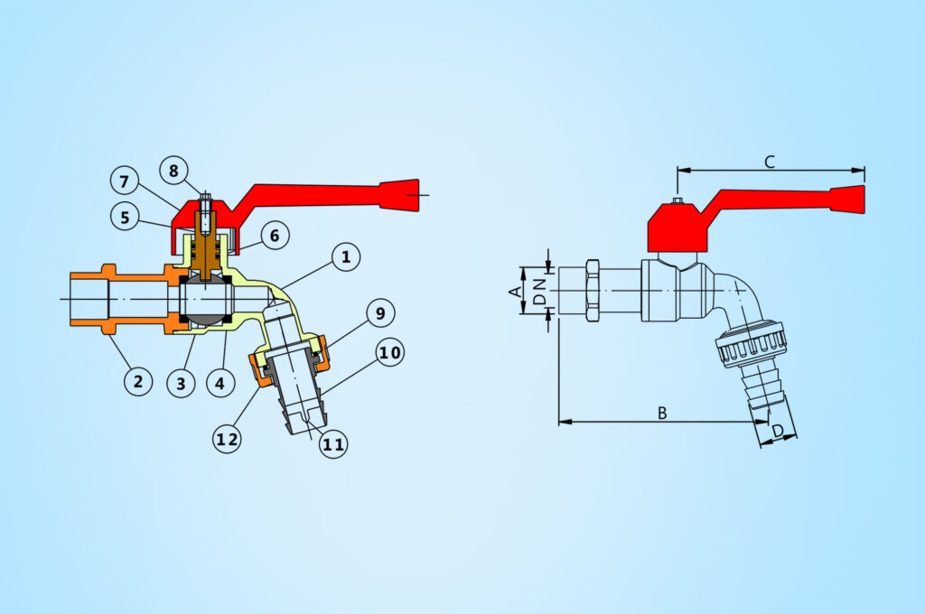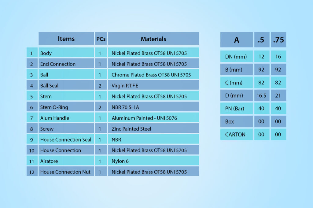 مصنوع من النحاس عالي الجودة بتقنية التشكيل الحراري الحديثة. بدلاً من المطاط، يُستخدم التفلون كحلقة داعمة للكرة لحمايتها من التسرب، مما يضمن فتحًا وإغلاقًا سلسين ويطيل عمرها الافتراضي. الكرة التي تتحكم بتدفق الماء مصنوعة من النحاس المقاوم للصدأ طوال عمر المنتج. المقبض مصنوع من الألومنيوم المصبوب ومطلي بالإيبوكسي المقاوم للصدأ أيضًا. يتم اختبار كل صمام كروي للتأكد من عدم وجود تسريب قبل طرحه في السوق. يتوفر جسم الصمام بطلاء كروم.