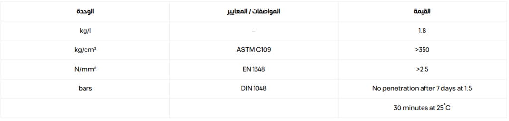 الخصائص خيارات الألوان: رمادي / أبيض اقتصادي وسهل الاستخدام، لا يتطلب سوى الماء • يوفر مقاومة عالية للماء ولصق ممتاز لجميع أنواع الخرسانة • خصائص ربط قوية مع مجموعة متنوعة من مواد البناء • آمن للاستخدامات المتعلقة بمياه الشرب — لا يؤثر على مياه الشرب • يقاوم الضغط الهيدروستاتيكي الإيجابي والسلبي •