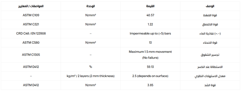 الخصائص مرونة عالية • حل عزل مائي دائم • مقاومة للتآكل والعوامل الجوية • قابل لنفاذ البخار • خصائص التصاق ممتازة • غير سام وصديق للبيئة • مقاومة عالية لانتشار أيونات الكلوريد • مثالي لتغطية الشقوق الصغيرة الناتجة عن الحركة • اقتصادي • يمكن إصلاحه بسهولة •