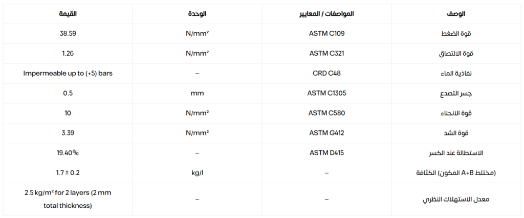 الخصائص شبه مرن • سهل التطبيق • يمكن إصلاحه بسهولة • اقتصادي • مقاوم للعوامل الجوية • التصاق جيد • غير سام وصديق للبيئة • مقاوم لانتشار أيونات الكلوريد •