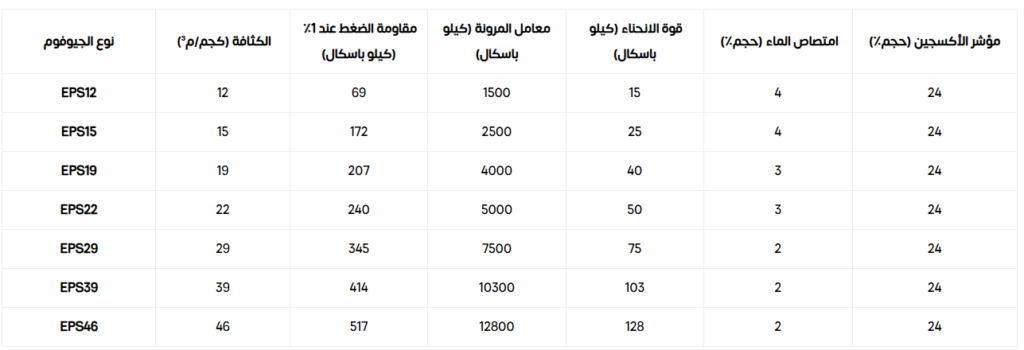 الخصائص خفيف الوزن جدًا — حوالي ١٪ من وزن التعبئة التقليدية للتربة مصنع وفقًا لمعيار ASTM D6817 للبوليسترين الخلوي الصلب متوفر بأنواع كثافة متعددة لتحسين الأداء الهيكلي وتقليل التكلفة مقاومة ضغط عالية مع سلوك مرن ممتاز مقاوم للرطوبة ولا ينتفخ أو يتحلل عند تعرضه للماء أو بخار الماء مستقر حراريًا مع متانة طويلة الأمد عند تكرار تغير درجات الحرارة متوفر بإضافة مقاومة للنمل الأبيض Perform Guard ومتوافق مع ICC-ES AC239 مقاوم كيميائيًا لمعظم المواد عند عزله بشكل صحيح عن المذيبات