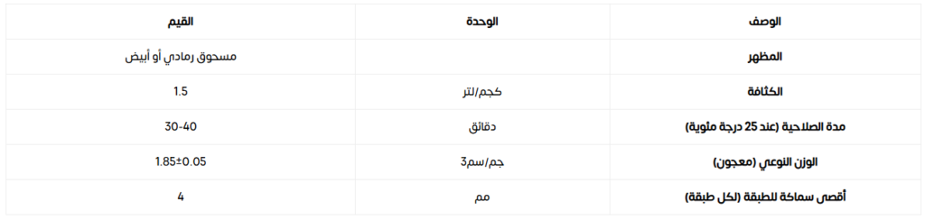 الخلط يتم خلط شيكارة وزنها ٢٠ كجم مع ٦–٧ لتر ماء يُخلط لمدة ٣–٥ دقائق حتى يتم الحصول على عجينة متجانسة